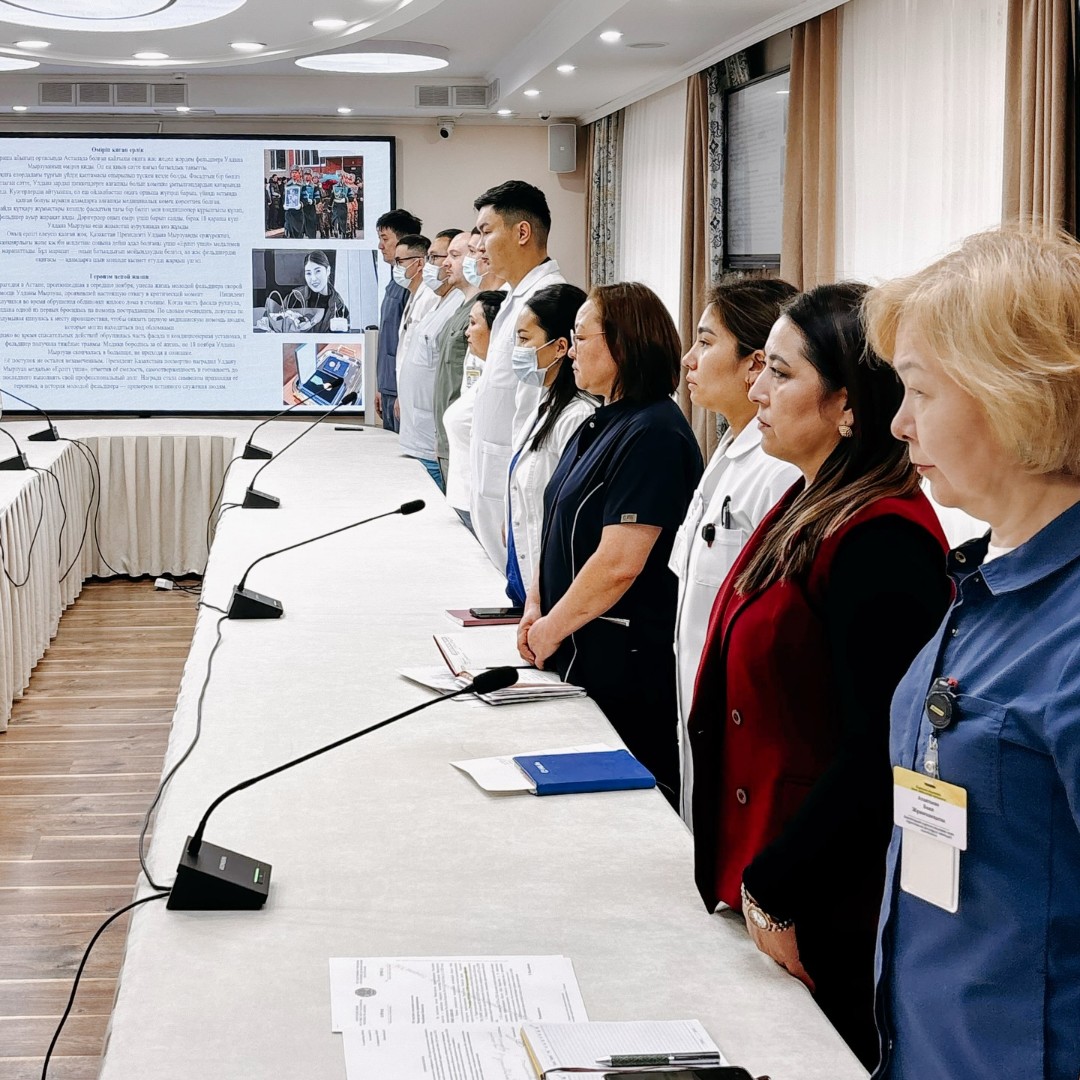Сегодня в ходе утренней планёрки коллектив Центра ядерной медицины и онкологии почтил память фельдшера скорой помощи Улданы Мырзуан, трагически погибшей после обрушения фасада жилого дома в Астане. Медработники почтили её память минутой молчания, назвав произошедшее невосполнимой потерей не только для близких, но и для всего медицинского сообщества страны.